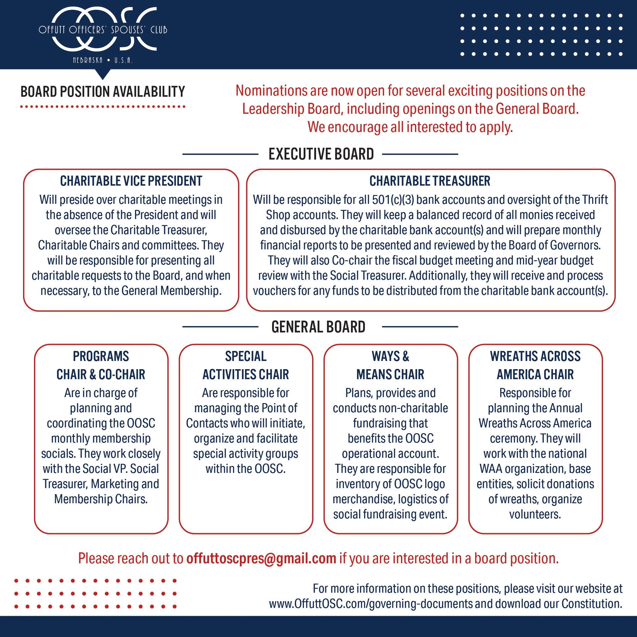 This is a fantastic opportunity to not only build connections, make an impact on supporting spouses and families here at Offutt, and vote on charitable giving across the nation, but also to add to your resume as a career building project.